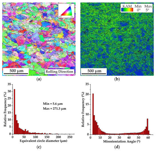 SEM EBSD orientation map after CR with HABs and LABs, denoted by black and white lines, respectively (a), KAM map (b), histograms of grain size (equivalent circle diameter) distribution (c), and grain misorientation distribution (d).