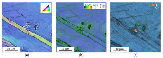 Magnified SEM EBSD. EBSD orientation map with HABs and LABs, denoted by black and white lines, respectively (a). KAM map (b), phase map with the matrix (austenite) in blue color, carbides enriched by Ti in orange color, and Cr in green color (c).