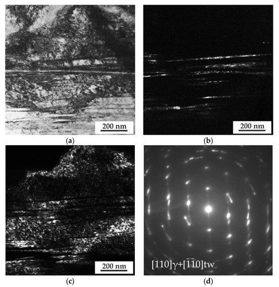 TEM images of microstructure after CR. BF image (a), dark-field (DF) images in twin reflection (b) and matrix reflection (c), SAED pattern, zone axes close to [110] matrix + [] twins (d).