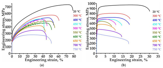 Stress–strain curves of the steel after ST (a) and CR (b) in the temperature range of 20 to 750 °C.