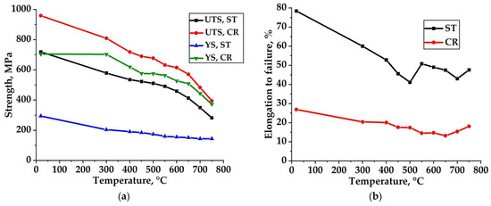 8], it can be noted that the modified steel, both after ST and CR, has higher values of elongation to failure and slightly lower values of strength properties in the temperature range of 20–600 °C. Moreover, at the maximum tensile temperature (750 °C), the modified steel after CR has fairly high yield strength values (≈370 MPa). Higher ductile properties are important under radiation near the operating temperature range, where the austenite solid solution decomposes with the precipitation of dispersed particles of M