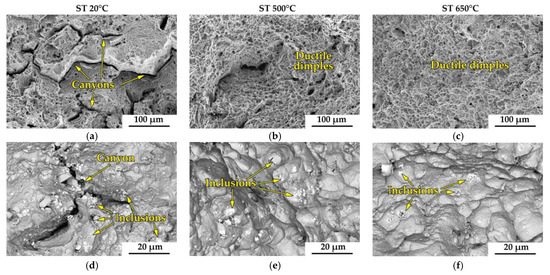 Fractographic images of the central part of tensile steel samples after ST, fractured at 20 °C (a,d), 500 °C (b,e), and 650 °C (c,f).
