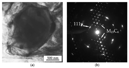 The carbide particles were investigated in more detail using TEM. From the analysis of Figure 5, it follows that the particle with characteristic dimensions of several microns is an M23C6 carbide, confirmed by the diffraction pattern (Figure 5b). A local stressed state is observed around the particle in the matrix, which is confirmed by the presence of multiple extinction contours in the bright-field image (Figure 5a) and azimuthal extension of matrix reflections in the diffraction pattern (Figure 5b). According to the elemental analysis results, this particle is mainly enriched in Cr; in addition, it has an increased content of Mn, V, Ta, W, and Si compared to the matrix.