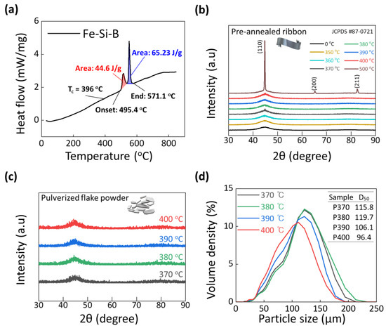 (a) Differential scanning calorimeter curves of Fe-Si-B ribbons. (b) X-ray diffractometer patterns of the Fe-Si-B ribbons before pre-annealing and Fe-Si-B ribbons pre-annealed at 350–500 °C. (c) X-ray diffractometer pattern and (d) particle size of flake powder after pre-annealing at 370–400 °C and ball milling.
