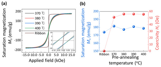 (a) Magnetic hysteresis loops and (b) saturation magnetization and coercivity of ball-milled flake powder after pre-annealing at 370–400 °C.