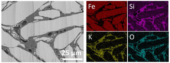 The cross-sectional microstructure of a toroidal core made of pulverized powder was observed, as shown in Figure 5. The white parts are flake powder; the black parts are additives such as potassium silicate and kenolube. Flake powders with maximum diameter of 90 μm and thickness of about 22 μm were partially arranged perpendicular to the molding direction. Therefore, as can also be seen in the microstructures shown in Figure 1 and Figure 5, flake powder arranged vertically due to the process of pressing from top to bottom was not observed; horizontally arranged powder, however, was observed. This arrangement improved permeability due to the small demagnetizing field due to the shape magnetic anisotropy. The potassium silicate solution used as a binder contains Si, K, and O elements. Potassium silicate exhibits excellent adhesion throughout the curing process. It also plays an important role in insulation by forming polysilicates between particles. Therefore, potassium silicate is a factor that reduces inter-particle eddy currents between particles. As a result of EDS analysis, Si, K, and O elements were confirmed between the particles, confirming that potassium silicate was located between the particles.