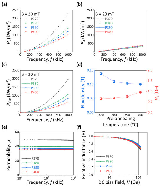 (a) Total core loss, (b) hysteresis loss, (c) dynamic loss, (d) magnetic flux density, coercivity (e) frequency dependence of permeability, and (f) relative inductance by amount of DC bias field of Fe-Si-B flake powder cores pre-annealed at 370–400 °C.