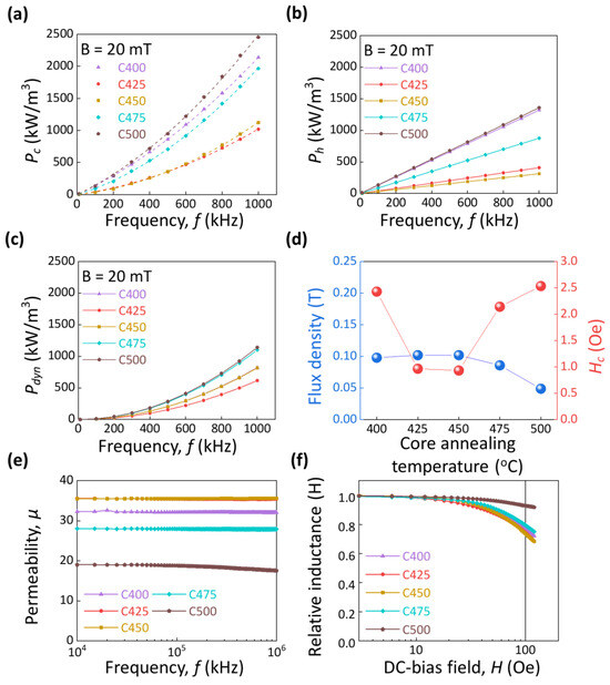 Figure 7 shows the total core loss per unit volume, eddy current loss, hysteresis loss, effective permeability, and DC bias of the C400–C500 samples. Figure 7a shows the core losses of the C400–C500 samples measured at Bm = 20 mT and f = 10–1000 kHz. C500 showed the highest core loss, while C425 showed the lowest. Samples annealed at temperatures above 425 °C showed an increasing trend in core loss as the core annealing temperature increased. The results, fitted using Equation (3), are shown as dashed lines; they match well with the experimental data. The core loss values of the C400–C500 samples measured at Bm = 20 mT and f = 10–1000 kHz were classified according to the coefficients of hysteresis and dynamic loss, as shown in Figure 7b and Figure 7c, respectively. In Figure 7b, it can be seen that the hysteresis loss decreased until the core annealing temperature reached 450 °C, and then increased again. As can also be seen in Figure 7d, the lowest coercivity was observed at a core annealing temperature of 450 °C, and the trend of coercivity was similar to that of hysteresis loss. Crystallization resulting from annealing at temperatures above 475 °C caused an increasing trend in hysteresis loss. As shown in Figure 7c, dynamic loss decreased until the core annealing temperature reached 425 °C, and then increased again. Residual stresses generated during the pressing process can be adequately eliminated by core annealing at temperatures above 425 °C.