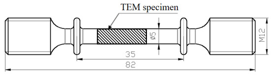 The present work was carried out on 30 mm-thick 7B04 commercial aluminum alloy. The composition was Al-5.71Zn-2.37Mg-2.03Cu-0.27Mn-0.16Fe (wt.%). The as-received material was solution-treated at 470 °C for 1 h, followed by 1.5–3% hot-rolled, and aged 120 °C for 5–10 h, which is named temper of 7B04-P. The creep test samples were machined along the rolling direction with the extensometer length of 35 mm, the geometry of the samples is shown in Figure 1.