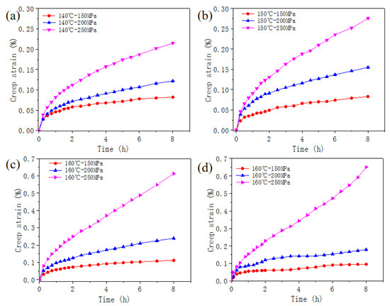 Creep curves under different applied tensile stress for 8 h; (a) at 140 °C; (b) at 150 °C; (c) at 160 °C; (d) at 160 °C of 7B04-T7451 al alloy.