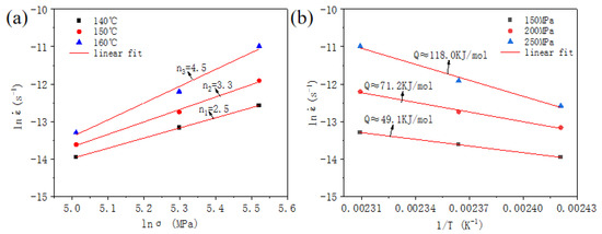 Value of stress exponent (n) can be calculated by the slope of the relation curve between ln and lnσ. Which indicated the deformation mechanism of stable creep stage. The stress exponent of the specimen at 160 °C was 4.5, which revealed that dislocation climb at high temperature leads to the value of n in the range of 4–6 [4,30]. The n of other specimen of 150 °C and 140 °C is about 3, the stable creep stage is the diffusion creep mechanism, creep was caused by the diffusion of particles from high concentration to low concentration, resulting in vacancy and lattice deformation [31,32]. Figure 3b shows the apparent activation energy of tension creep aging, on the other way, the smaller the activation energy is, the more conducive the creep strain increases [33]. The apparent activation energy increased with applied stress, at 250 MPa the Q ≈ 118 kJ/mol, which is slightly higher than that of AA2219-T3 alloy [34]. A large number of dislocations may lead to the low creep activation energy. Based on the above tests results, the higher temperature and greater tensile stress would lead to an increase in creep deformation efficiency, further, the number of dislocations would promote that, at the same time, the mechanical properties also play an important role in the comprehensive properties of 7B04-P al alloy.