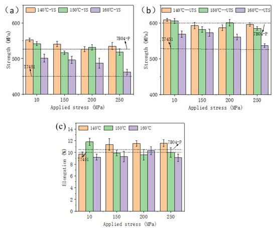Mechanical properties of 7B04-P al alloy samples after creep aging under different applied stress: (a) yield stress; (b) unlimited tensile stress; (c) elongation.