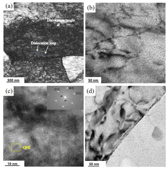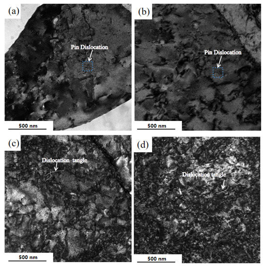 Figure 8 shows TEM images of 7B04-P al alloy at different tensile stress during creep aging. It was observed that pin dislocation present in Figure 8a,b, it is obvious that the dislocation density is much lower than the as-received sample, dislocation lines are smaller. It was observed that dislocation tangles and dislocation segments were distributed from Figure 8c,d.