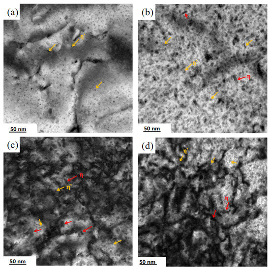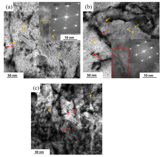 Figure 14 reveals the evolution of precipitated phase and dislocation morphology during creep aging under a tensile stress of 250 MPa 140 °C (as shown in Figure 14a), 160 °C (as shown Figure 14b) and approaching the aging temper of T7451 (as shown Figure 14c). The precipitates of the primary creep stage were GPZs and η’, a large number of uniformly distributed fine particle GP regions can be seen. In general, GP regions and η’ contribute to the strength of the material, furthermore, a number of dislocations and dislocation loops were good for the strength of alloy. The average diameter of GPZs and η’ was 4.88 nm. After 4 h of creep aging, the diameter of GPZs increased to 6.03 nm, and the number increased sharply compared with the T7451-P. The dislocations make links between precipitates, increasing the efficiency of the solute atom’s transfer from small precipitates to large ones [24]. In the creep aging process, stress accelerates the transformation of the GPZs into η’ phase, and the proportion of η’ phase rapidly increases to 68.51% and its diameter increases to 7.8 nm after 4 h. As the aging time increases, the proportion of η’ increases slowly at 8 h and 12 h. Reaching the peak strength when the proportion of GPZS and η’ reaches a certain proportion after creep-aging 8 h (Figure 9b and Figure 11a), and the average size of GP zones increases greatly in the first 4 h of creep aging process. Size increase slowly, in the subsequent creep aging literature [3] showed that GP zones size is bigger, the distance between each other is small, and the deformation process of GPZs per unit length of interaction between exposure to many more dislocation cutting, making it much more difficult to cut, improve the strength of the alloy, aluminum alloy after aging strength rising trend, With 8 h aging, η phase appears, and the mechanical properties of the material begin to decrease slightly. After 12 h creep aging, the proportion of η increases by 11% compared with 8 h, but the yield strength only decreases by 18 MPa.