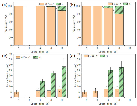 The number frequency and Average diameter of GP zones/η’ precipitates and η precipitates during creep aging: (a,c) at 140 °C; (b,d) at 160 °C.