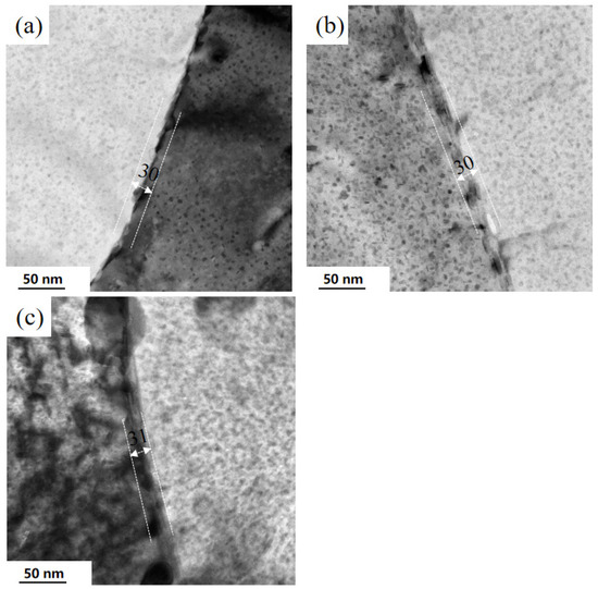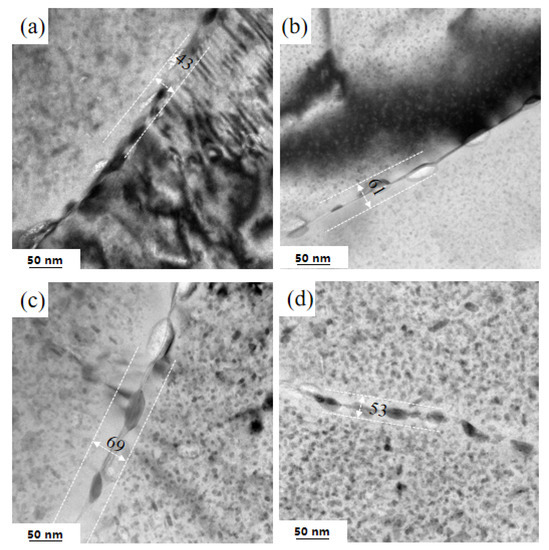 Figure 12 shows the TEM images of grain-boundary under a uniaxial tensile stress of 250 MPa at 140 °C during creep aging. After 4 h creep aging, it is found that the creep aging can promote the distribution of the GBPs and increase the width of PFZ to 30 nm after creep aging 4 h (as shown in Figure 12a), and slightly larger precipitates (GPBs) can be observed at grain boundaries. In the process of electrolytic polishing, large precipitates (GPBs) are corroded and fall, forming corrosion pits and showing bright colors in the bright field. But with the increasing creep aging time, the width of PFZ is not affected after creep aging 8 h (shown Figure 12b), however, the stable and coarse GBPs appear, moreover, the average size of GBPs increased slightly and more discontinuous, From the perspective of microstructure, due to the large size and spacing of GBPs and the large width of PFZ [51], it implied that the evolution of GBPs and PFZs were good for the corrosion resistance (CSS) of the alloy with increasing of creep aging time. In general, the formation of PFZ is caused by the segregation of solutes toward the grain boundary [52]. Due to the low creep aging temperature, the diffusion rate of solute atoms in the grain boundary is slow. High supersaturated vacancy concentration in regions far from grain boundaries would accelerate precipitate growth and transition. Therefore, the width of PFZ does not change much with aging time. However, when the aging temperature at 160 °C, the variation of grain boundary was different, as shown in Figure 13 After 1 h creep aging, the width of PFZ was 43 nm, which is obviously much wider than the aging at 140 °C for 4 h (as shown Figure 12b), indicating that the distance between precipitates increased greatly. After 4 h creep aging, the width of PFZ was wider than that of 1 h creep aging (Figure 13b) the width of PFZ was 61 nm, the GPBs was clearer and the size was further increased. After 8 h, the width of PFZ was 69 nm, which was slightly wider than that after aging 4 h. After 8 h under applied stress of 10 MPa (T7451-treated), the width of PFZ was 53 nm (Figure 13c). Slots of 160 °C near the grain boundary to the grain boundary diffusion speed faster, precipitated phase of the supersaturated precipitation phase required high vacancy concentration, grain boundary solute atoms consume faster, which prompt the wider PFZ, meanwhile, GPBs may be larger in a stable state, vacancy concentration near the thermal equilibrium concentration, solute atoms consume slowly near grain boundary, meanwhile, the change rate of PFZ width becomes smaller [53]. It is stated that PFZ and GPBs have a positive effect on the stress corrosion properties of materials, which is bad for the strength. It confirms that the material mechanics performance fell sharply in this condition (as shown in Figure 6), the stress corrosion resistance of the material can be improved more at 160 °C than T7451-state, which correspond to the evolution of electrical conductivity (as shown Figure 4b).