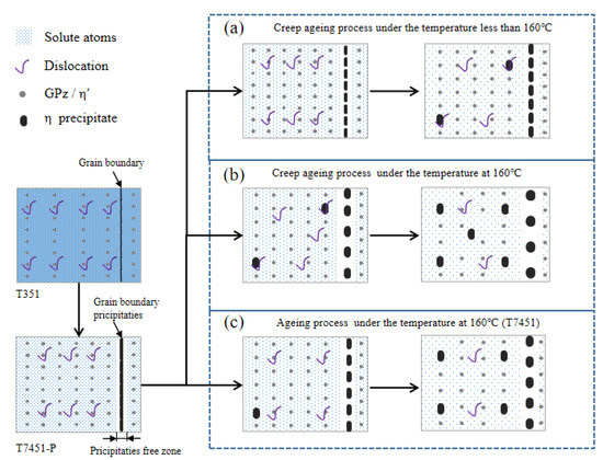 Schematic illustration of microstructure evolution during creep aging tests at: (a) low-temperature high stress; (b) high temperature with high stress; (c) high temperature with unstressed.