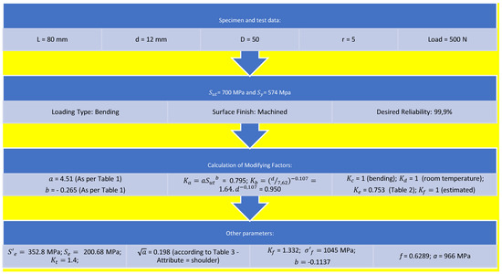 when ≤ 1460 MPa; MPa, when > 1460 MPa. However, when the material’s microstructure is known, it is possible to obtain a more approximate result from the tabulated ratios [22]. The stress amplitude is denoted as , which is the cyclic stress amplitude that causes fatigue failure. The maximum and minimum stresses are symbolized by and , respectively. Knowing , allows calculation of the number of cycles to failure according to [22]:
