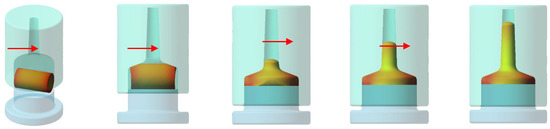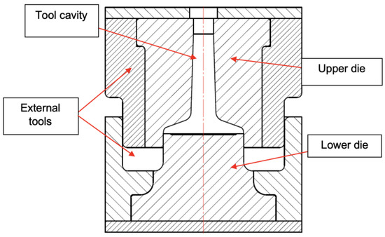 A preform is an initial geometry similar to the final geometry that is transformed into the part’s final configuration without causing material failure or degrading material properties. It is necessary to optimize the preform to reduce the underfill defect with minimum forging load and effective stress [5,6]. One problem that may occur is the wear caused by a local bonding between the hot workpiece and the dies and a thermal softening phenomenon of the dies [7]. The factors influencing die life are mechanical loading, thermal fatigue, plastic deformation, and wear, among others. In the forging process, hot working refines the grains, increasing strength and ductility, as forged components have a low probability of having internal defects, unlike castings. Parameters such as internal defects can influence fatigue design [7,8].