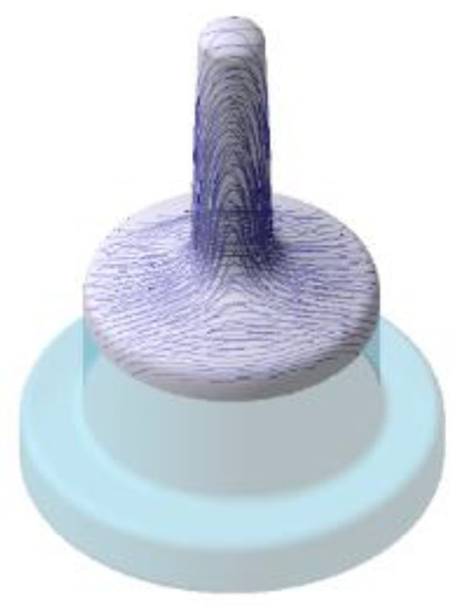 Figure 6 and Figure 7 demonstrate the positioning of the blank within the tooling, the flow of the material filling the tool, and the intended fiber orientation. These images were obtained through a simulation of the forging process in Qform software (QuantorForm Ltd., Fujairah, United Arab Emirates) using the data from Table 5. This simulation was used only to check if the amount of material was adequate for the actual forging process and the expected fiber development for the specimen. Temperature boundary conditions at the tools were set to mimic the real manufacturing conditions, i.e., 250 °C.