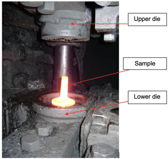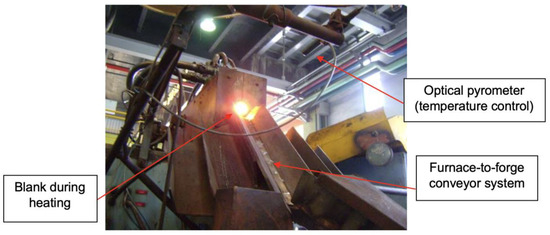 The typical extrusion forging process was performed in a mechanical press, where first the blanks were heated in an induction furnace between 1150/1200 °C, as shown in Figure 8, and then forged in a 9800 kN mechanical press, as shown in Figure 9 and Figure 10, in a tool made of AISI H13 material previously heated between 200 and 250 °C. Figure 11 shows the layout of the forging tool.