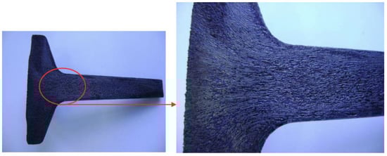 A sample of each configuration was metallographically analyzed to confirm the orientation of the fibers generated in the specimens. To this end, the specimens were cut lengthwise, sanded, and attacked in a 30% sulfuric acid (H2SO4) solution heated between 80 °C and 90 °C as recommended by ABNT NBR 8108. Blue tracing paint was applied over the attacked surface to make the fiber lines visible. Figure 15, Figure 16 and Figure 17 show the fibers revealed on the specimens of the three proposed configurations.