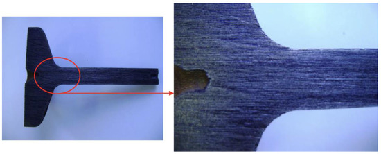 Figure 1. Configuration A (left: blank with longitudinal fiber direction, and right: specimen with resulting fiber). - Configuration B (Figure 2): simulated a forged component with its orientation nonadequate because its fibers were arranged along the cross direction of the specimen, that is, at 90° from the rolling direction;