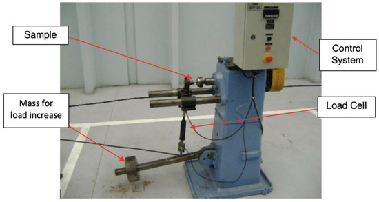 To evaluate the components’ fatigue life, a rotational flexural fatigue tester or rotating beam was used, which caused the maximum stress in the region of the beam due to the moment caused by the load coupled to the end of the specimens (Figure 18 and Figure 19). A load of 500 ± 50 N was applied to the specimens coupled at 80 mm from the clamping system with a constant frequency of 8.33 Hz. The equipment recorded the number of cycles applied to the specimen until it ruptured.