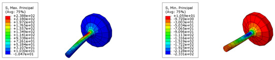 Additionally, to determine stress values, a simple linear elastic, isotropic simulation resorting to eight-node first-order solid elements (incompatible modes) was performed using Abaqus Software 2021 (Dassault systems, Vélizy-Villacoublay, France), Figure 20. Applying the loads and boundary conditions of the fatigue test yielded stress values of MPa and MPa. Finally, from Equation (2), and based on the numerical predictions for stress amplitude, the foreseeable number of cycles was determined as 13,576.