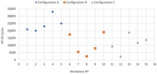 The fatigue strength of a component has many associated variables (see Equation (7)), making the determination of exact values a challenging task, which explains the high standard deviation values shown in Table 6 and Figure 21 and Figure 22. Even so, the tests allowed us to demonstrate how the changes in the manufacturing process variables predicted changes in mechanical and metallurgical characteristics, influencing the component’s fatigue life.