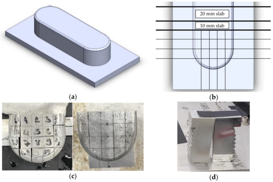 (a) Schematic figure of the stadium-shaped blocks made by MELD method; (b) Wire EDM cutting lines on the original block; (c) Cutting layout of samples; left: sample A, right: sample B; The cross-section of each numbered bar shown is 10 mm by 10 mm; (d) The 20 mm slab from Sample B is cut in half and one of the halves is polished to improve the quality of the neutron interferometry imaging for detecting internal neutron dark-field (scattering) features. The thickness of the build plate is ½ inch.