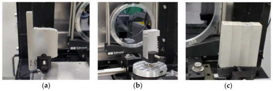 Samples mounted on holders in front of the neutron beam; (a) 10 mm slab from ingot A for 2D imaging; (b) 20 mm slab (polished half) from ingot B for 3D imaging; (c) N1, N2, N3, and N4 bars from ingot B.