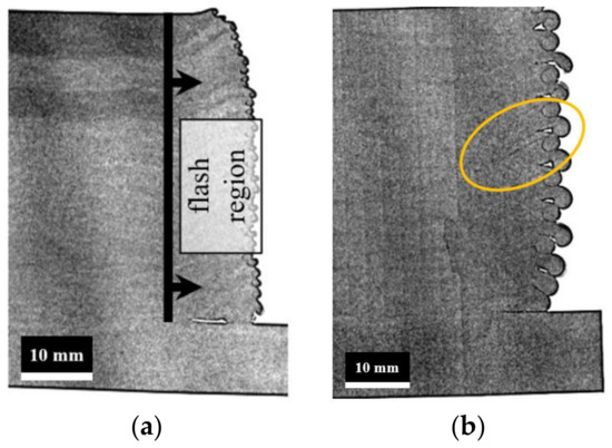 The transmission image shows two separate sets of darker layers at the top of the print (Figure 6a). In transmission images, darker areas correspond to regions that neutrons could not easily get through (either absorbed or scattered) and the neutron flux attenuation is higher. Assuming that the process parameters were fixed throughout the process, one factor that could be different between the bottom and top layers is the feedstock rod preparation procedure. Since the dry graphite lubricant is manually sprayed on the feedstock rod by an operator, the thickness of the graphite layer can be different each time. However, we have not explored the metallurgical effects of the dry graphite lubricant in the deposited material and its impact on the transmission image so far. The bonding between the printed part and the substrate is incomplete in the flash region, as we expect, mainly because the substrate is at room temperature and the tool does not have contact with it in the flash region to warm it up and make a stronger bond.