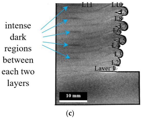 The 3D nCT results for this sample are not presented due to the low signal-to-noise ratio. However, in the 2D transmission image, the interlayer regions are more noticeable (Figure 6c). The intensity of dark areas shows two periodic patterns. For each layer, a faint dark line is visible in the interlayer region. More interestingly, the dark regions get more intense (darker) between each two layers (especially under the tool). Since the slabs are cut from one end of the original ingot, the temperature of the layer underneath can be different depending on the spindle transverse direction and its position related to the entire part. In Figure 6c, the dark regions are denoted with arrows. More specifically, these regions are located between Layers 2 and 3, Layers 4 and 5, Layers 6 and 7, Layers 8 and 9, and Layers 10 and 11.