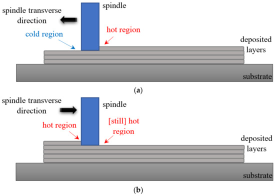 The general overview of layer deposition using AFS-D is illustrated in Figure 7. At the beginning, the spindle deposits a hot layer of material on the cold substrate. In all of our experiments, layers were deposited in a continuous back-and-forth manner. Therefore, once the first layer is deposited, it takes a while for the spindle to come back to the same location and deposit the next layer. This delay gives the previous deposited layer some time to cool down. In this case, a hot-on-cold layer deposition will occur (Figure 7a). The longer the block, the colder the bottom layer will be with the same traverse speed. This temperature difference becomes even larger when the process stops for reloading the feedstock magazine. Subsequently, when the spindle returns, there is not enough time for the previous layer to cool down right at the beginning and the beginning of the return course will be a hot-on-hot layer deposition (Figure 7b). This phenomenon could be one possible explanation for seeing alternating intense dark regions for each two layers in the transmission image.