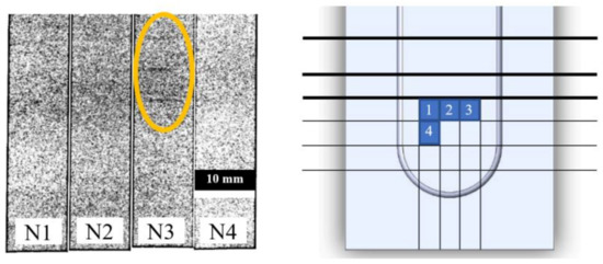 Moreover, these intense dark areas exist only under the spindle protrusion structures, which underpins the temperature effect assumption even further. The transmission images taken from the internal rods also support this finding (Figure 8). The dark regions are more visible in rod N3, which is under the spindle protrusion structures.