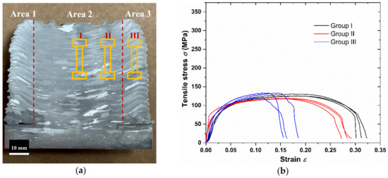 Tensile testing results of a slab from ingot A [6]. (a) position of the dog bone samples in the slab: Group I is in the middle, Group II is under the tool protrusion, and Group III is in the flash region. The gauge cross section of the specimen is 2 mm by 2 mm. (b) Stress–strain curve of each Group.