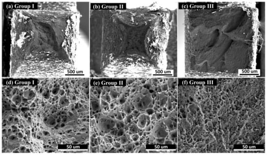 Figure 10 shows the morphology of fracture surfaces after tensile tests for the samples from Groups I, II and III. A larger fracture surface area reduction is observed for the Group I and Group II samples than that in the Group III counterparts (Figure 10a–c), which is in good accordance with the engineering stress–strain curves shown in Figure 9b. The tensile test dog-bone samples from Groups I and II underwent clear necking processes (tensile stress dropping before fracture in Figure 9b), indicating good ductility. However, for Group III samples, the stress–strain curves mainly rose before fracture, which indicates that the samples mainly underwent the strain-hardening process without going deep into the necking process. To gain a better understanding of the tensile behaviors, facture surface morphologies with higher magnification were evaluated, displayed in Figure 10d–f. Compared with the obvious dimple structures observed in the Group I and II samples, the dimples on the facture surfaces of the Group III samples are significantly smaller and their depths are clearly shallower, indicating inferior ductility. With close observation, the dimple structures on the Group I sample fracture surface are slightly larger and deeper than those on the Group II samples, which corresponds to the slightly better ductility for Group I samples shown in Figure 9b.
