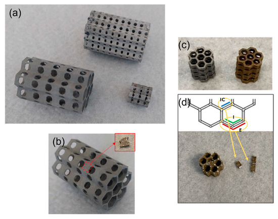 Samples were manufactured using two combined technologies: 3D printing (fused deposition modeling, FDM) and investment casting. Firstly, additive manufacturing from polylactide (PLA) produced the exact polymer patterns for casting. Honeycomb perforated models were designed in Autodesk Inventor Professional 2018 software, and on their basis, the G-code files were created in the PrusaSlicer program. Next, spatial biomimetic PLA samples were produced using a Prusa I3-MK3S 3D printer. The patterns were fabricated in three types: 2 bigger ones (approximately 20 mm in diameter, 30 mm in height) with differing perforations of Φ 1.5 or 3 mm and one smaller (approximately 10 mm in diameter, 10 mm in height with orifices of Φ 1 mm).