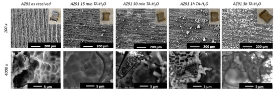 SEM and macro images of AZ91 samples before and after the TA coating in a water solution for different dipping times.