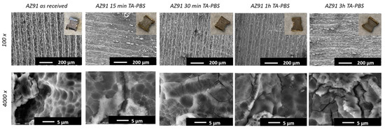 SEM and macro images of AZ91 samples before and after the TA coating in a PBS solution for different dipping times.