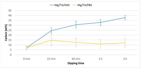 Figure 4 plots the carbon content on the surface of the as-received and TA-coated, in different conditions, AZ91 samples. The TA coating induces an increase in the carbon content (from 7% to 37% for the TA coating formed in water for 3 h), which is significant, even if carbon is ubiquitous on surfaces and its quantification by EDS can be affected by instrumental errors up to 1%. The reported values cannot be quantitatively precise because of the limits of EDS in measuring the carbon content. Still, they suggest that the coating is more effective and homogeneous when performed in water than in PBS: higher carbon content (the carbon content rises to 37% when the coating is performed in water and only up to 12% when performed in PBS), lower standard deviation, and better substrate coverage (the magnesium content is reduced to 11% on samples coated in water and 22% on the ones coated in PBS from a starting content of 52%). In agreement with SEM observations, EDS results suggest a submicrometric coating thickness: the EDS penetration depth is close to 1 µm, and the Mg substrate is still detectable after the coating. The higher ability of TA to form a coating on Mg alloy when dissolved in water can be explained by considering the pH of the two solutions: it is 3.5 for the water solution and 6.1 for the PBS one. It can be hypothesized that more Mg2+ ions are released into the solution in an acidic environment during the coating procedure. They act as bridges for the formation of tannic acid–magnesium ions complexes at the surface, as reported in the literature [12,14]. The authors have previously observed a similar effect for the Ca2+ ions and polyphenols grafting on metallic surfaces [22]. Moreover, a shielding effect due to the possible precipitation of magnesium phosphates from PBS [1] cannot be excluded.
