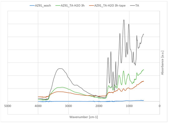 The samples of AZ91 as-received (washed) and coated in optimized conditions (3 h in a tannic acid water solution) were analyzed before and after the tape adhesion test with FTIR-ATR. The spectrum of tannic acid (TA) is reported as a reference.