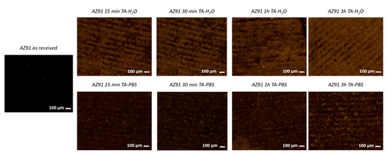 Fluorescence microscopy (Figure 7) evidences a complete absence of a fluorescent signal on the as-received material, as expected, and the presence of a visible red–orange signal on the coated AZ91 samples, which is particularly evident for the ones coated in the solution of tannic acid in water with an immersion time of 3 h. This effect is due to the polyphenols’ auto-fluorescence.