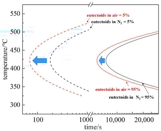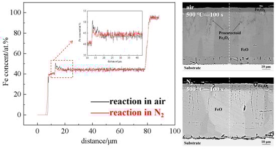 - In air conditions, there is a high concentration enrichment of Fe ions at the Fe3O4-FeO interface because of the oxygen in the environment, which gives priority to the formation of Fe-rich FeO and makes the eutectoid phase transition time earlier than N2 conditions.