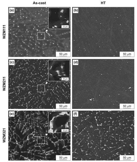 Microstructure (SEM) of magnesium alloys (a,b) WZM111, (c,d) WZM211, and (e,f) WZM321: (a,c,e) as-cast state and (b,d,f) after heat treatment (HT).