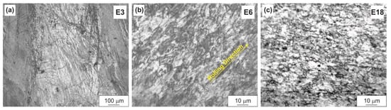 The evolution of the microstructure with an increase in the reduction ratio differed in the three alloys and, in addition, depended on the rolling temperature. Thus, in the WZM111 alloy, after rolling at a temperature of 400 °C to a low reduction ratio (E3), a deformed structure with numerous intersecting shear bands was observed (Figure 3a). With an increase in the reduction ratio to E6, equiaxed grains with a predominant size of 4–8 μm were formed in the alloy structure as a result of dynamic recrystallization (Figure 3b). The grains were elongated in the rolling direction. With a further increase in the reduction ratio to E18, the predominant grain size decreased to 3–5 μm, and the grain shape tended to be equiaxed (Figure 3c).