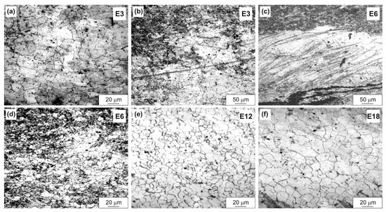 With an increase in the rolling temperature to 450 °C, the equiaxed grains in the structure of the WZM111 alloy were already formed at a reduction ratio of E3 (Figure 4a), although the deformed areas remained (Figure 4b). The predominant size of such grains was 10–20 µm. With an increase in the reduction ratio to E6–E18, an alternation of the deformed areas and the recrystallized grains was observed in the structure, and the grain size both increased and decreased with the increasing reduction ratio (Figure 4c–f). The body of many grains contained parallel slip bands. This indicates the incompleteness of the dynamic recrystallization process. In addition, the precipitating process of the α-Mn particles, which can contribute both to the recrystallized grain refinement and additional strengthening, was superimposed on the microstructure formation process. According to the calculated equilibrium phase composition of the alloys for the rolling temperatures, the fractions of the α-Mn phase in all three alloys were about 0.4% at 450 °C and about 0.6% at 400 °C (see Table 3).