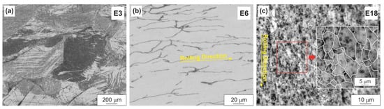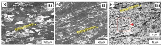 The dynamic recrystallization process in the WZM321 alloy was the most difficult, which is also associated with the precipitation of numerous LPSO phase particles. Thus, at a low reduction (E3), the original large grains with strongly distorted boundaries, elongated in the direction of rolling, were retained in the alloy structure (Figure 6a). The recrystallized grains began to form only at high reductions (E12). However, even after maximum reduction (E18), a slight elongation of the grains along the direction of rolling was observed (Figure 6c). At the reduction value of E18, the grain size was 3–8 µm.