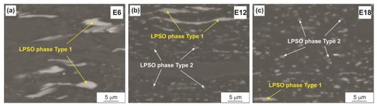 Before rolling, as noted above, the LPSO phase particles were present only in the WZM321 alloy. During rolling, the LPSO phase particles precipitated in the WZM211 and WZM321 alloys, which hinders dynamic recrystallization. As an example, Figure 7 shows SEM images of the WZM321 alloy structure after rolling with different reductions. At low reductions (E3-E6), the structure contains large particles of the LPSO phase, up to 50 µm in length (particles of Type 1 in Figure 7). These particles were present in the structure of the alloy before rolling. With an increase in the reductions (E12–E18), large particles of the LPSO phase were elongated in the direction of rolling, and fine particles of the LPSO phase, 0.5–2 µm in size, precipitated in the structure (particles of Type 2 in Figure 7).